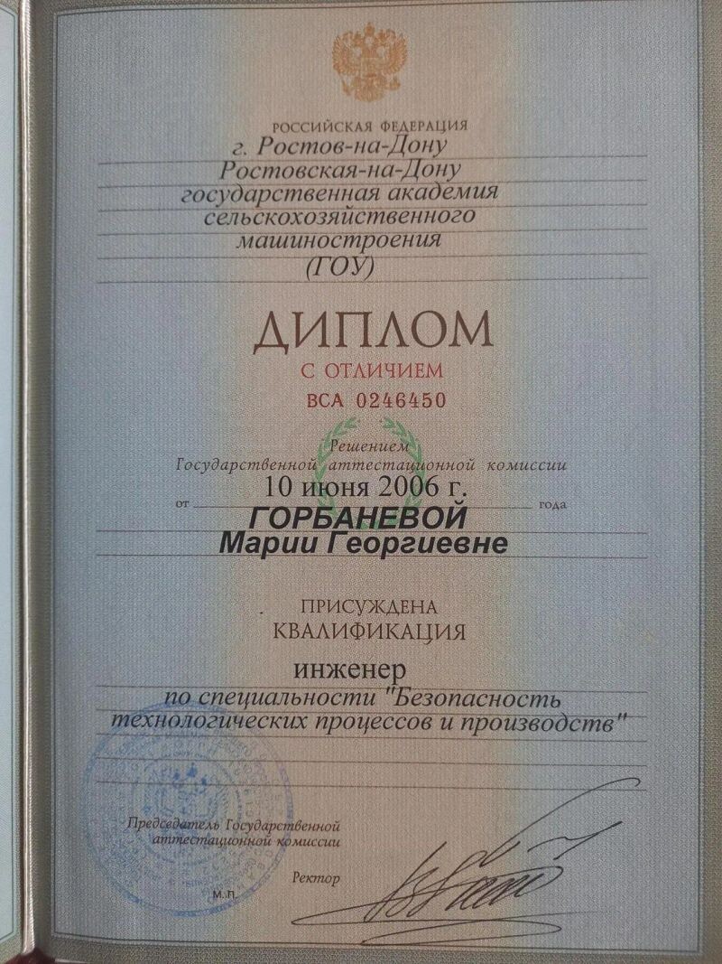 - Ростовская-на-Дону государственная академия сельскохозяйственного машиностроения, инженер по специальности "Безопасность технологических процессов и производств", 2001–2006 гг.