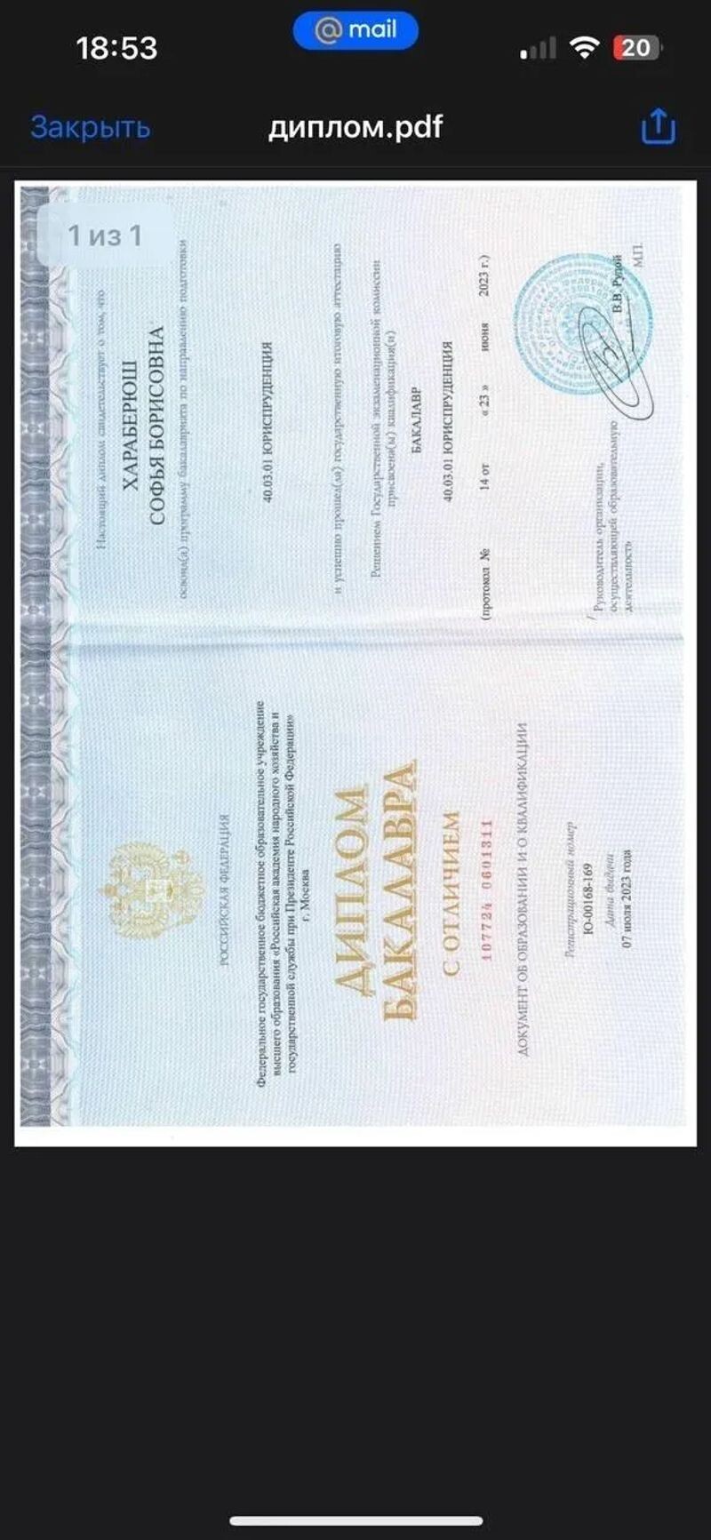 - Российская академия народного хозяйства и государственной службы при Президенте Российской Федерации, юриспруденция, бакалавр, 2019–2023 гг.