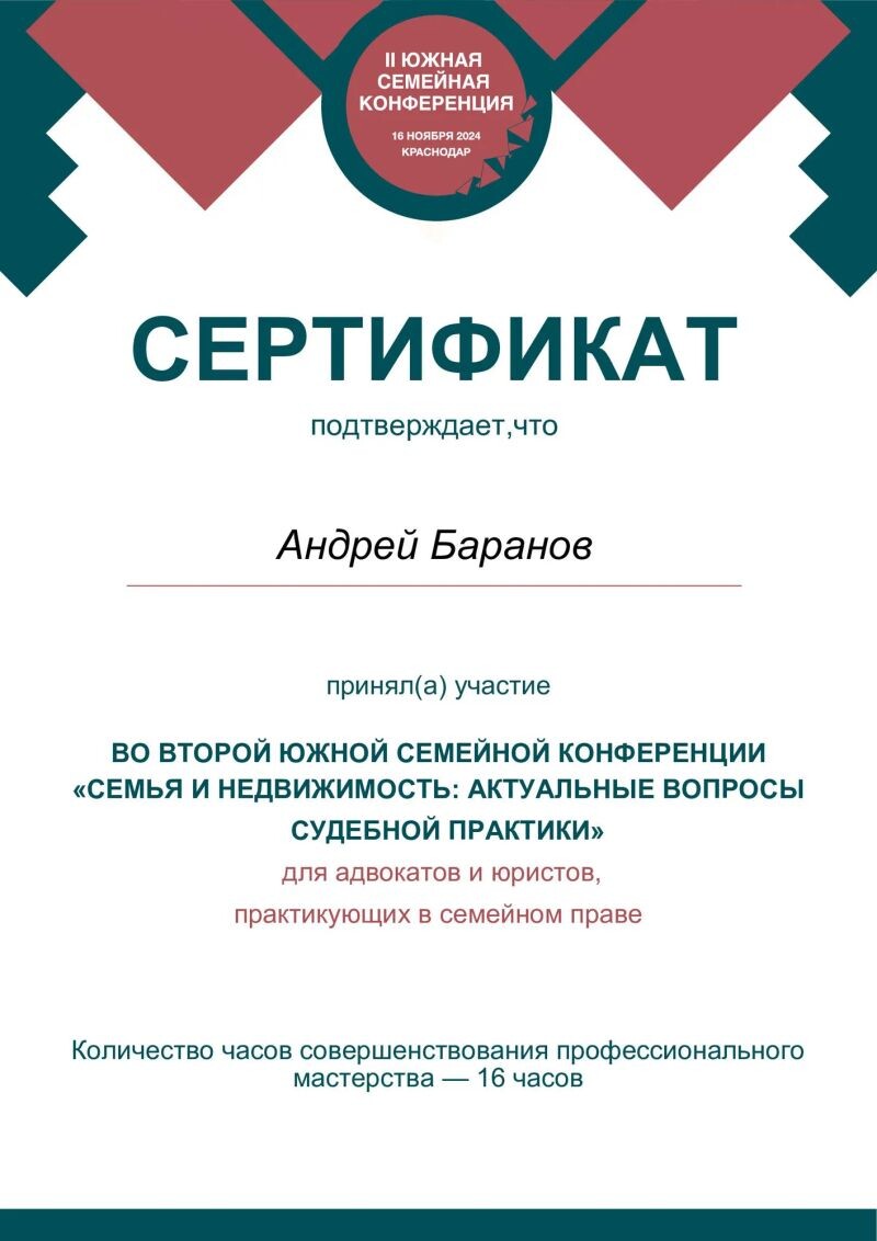 - Сертификат участника Второй южной семейной конференции «СЕМЬЯ И НЕДВИЖИМОСТЬ: АКТУАЛЬНЫЕ ВОПРОСЫ СУДЕБНОЙ ПРАКТИКИ», 2024 г.