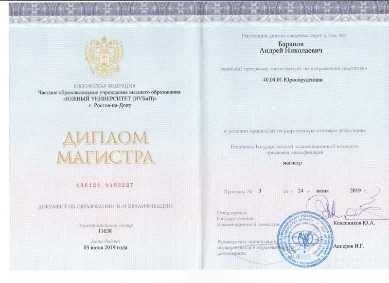 - ЧОУ ВО «Южный университет»(ИУБиП), академия права и национальной безопасности, юриспруденция, цивилистика (магистратура), 2017–2019 гг.