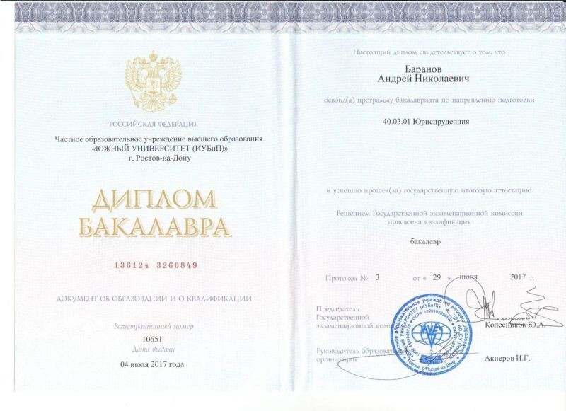 - ЧОУ ВО «Южный университет»(ИУБиП), академия права и национальной безопасности, юриспруденция (бакалавриат), 2013–2017 гг.