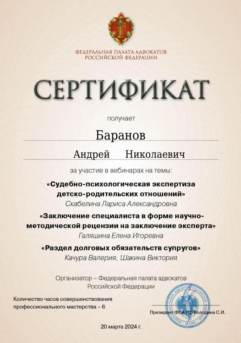 - Федеральная палата адвокатов РФ, вебинары «Судебно-психологическая экспертиза детско-родительских отношений», «Заключение специалиста в форме научно-методической рецензии на заключение экспертов», «Раздел долговых обязательств супругов», 2024 г.