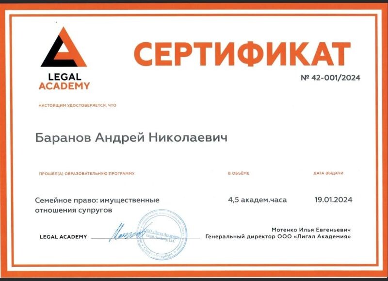 - Legal Academy, программа «Семейное право: имущественные отношения супругов», 2024 г.