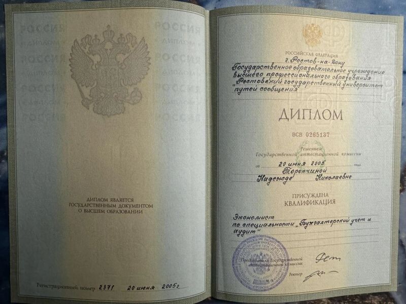 - Ростовский государственный университет путей сообщения, бухгалтерский учёт и аудит, экономист, 1999–2005 гг.