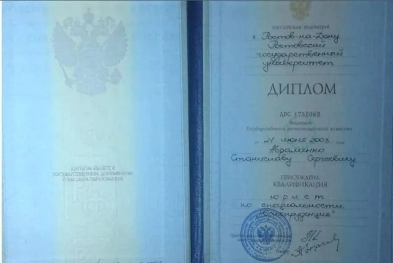 - Ростовский государственный университет, юриспруденция, юрист, 1997–2003 гг.