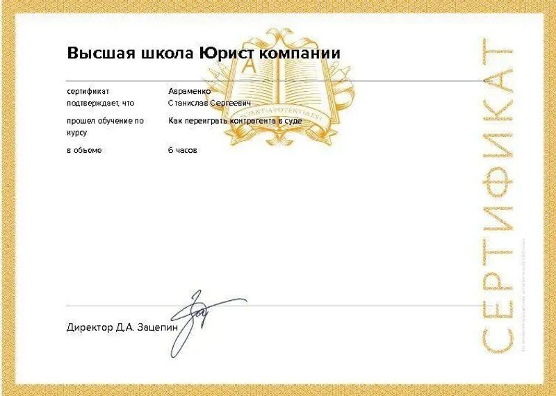 - Высшая школа юрист компании, курс «Как переиграть оппонента в суде», 2021 г.