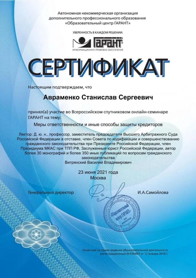 - Образовательный центр «Гарант», всероссийский спутниковый онлайн-семинар «Меры ответственности и иные способы защиты кредиторов», 2021 г.