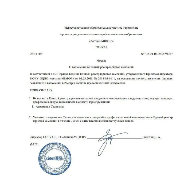- Актион-МЦФЭР, включение в единый реестр юристов, 2021 г.
