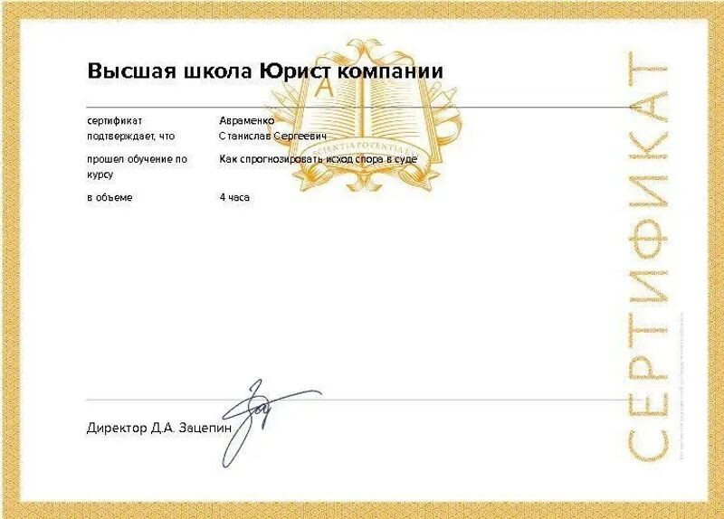 - Высшая школа юрист компании, курс «Как спрогнозировать исход дела в суде», 2021 г.