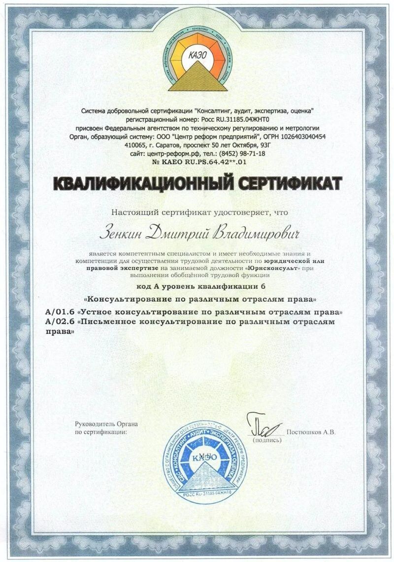 - Система добровольных сертификаций «Консалтинг, аудит, экспертиза, оценка», квалификационный сертификат «Консультирование по различным отраслям права», 2020 г.