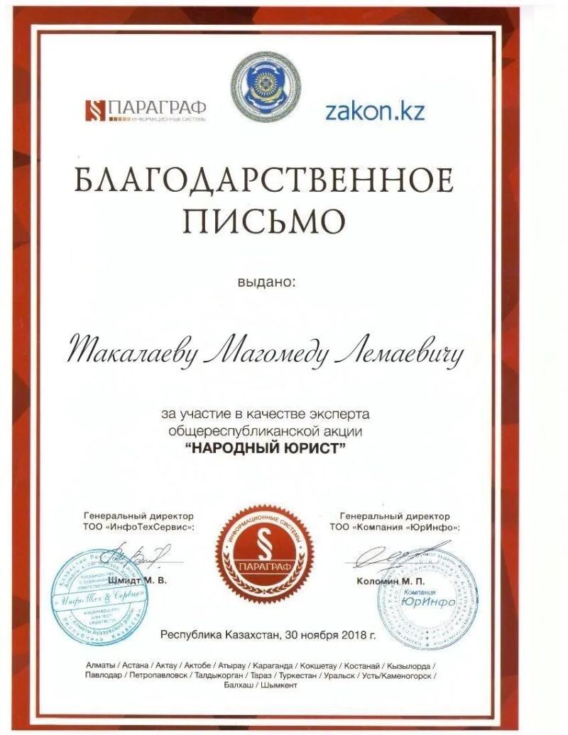 - Благодарственное письмо «Народный юрист» (с 2018 г.).