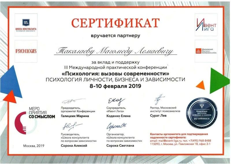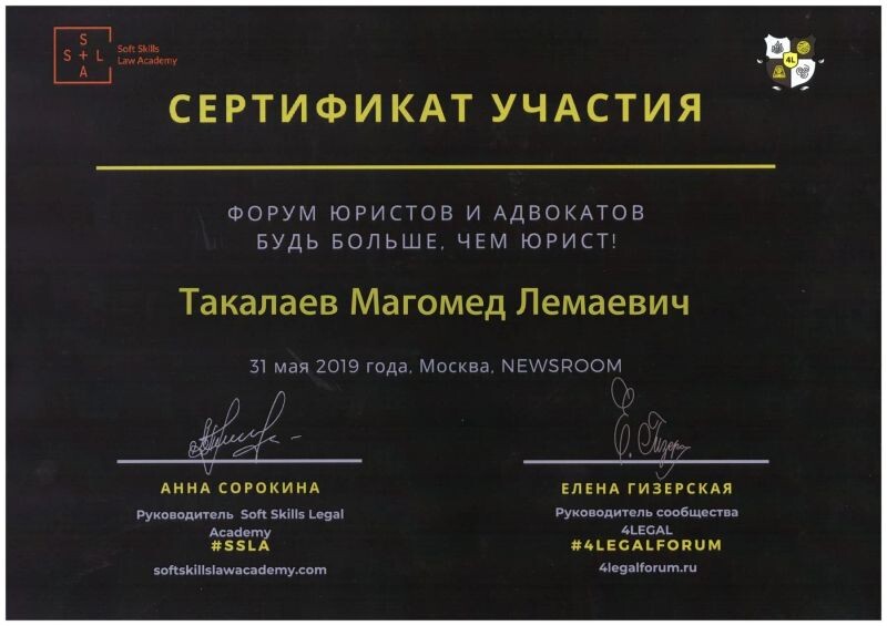 - Сертификат «Форум юристов и адвокатов, будь больше чем юрист» (с 2019 г.).