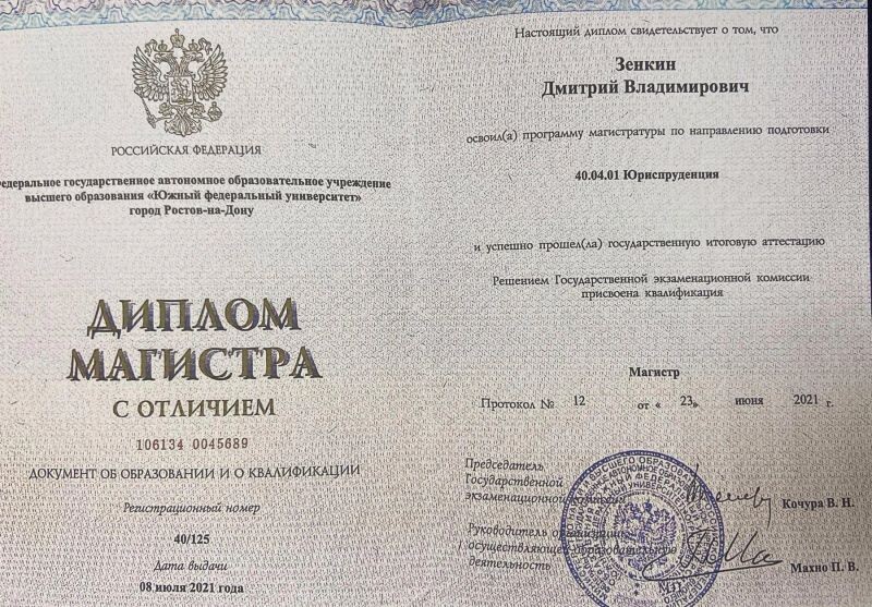 - Федеральное государственное автономное образовательное учреждение высшего образования «Южный федеральный университет», юридический факультет, юриспруденция, 2019–2021 гг.