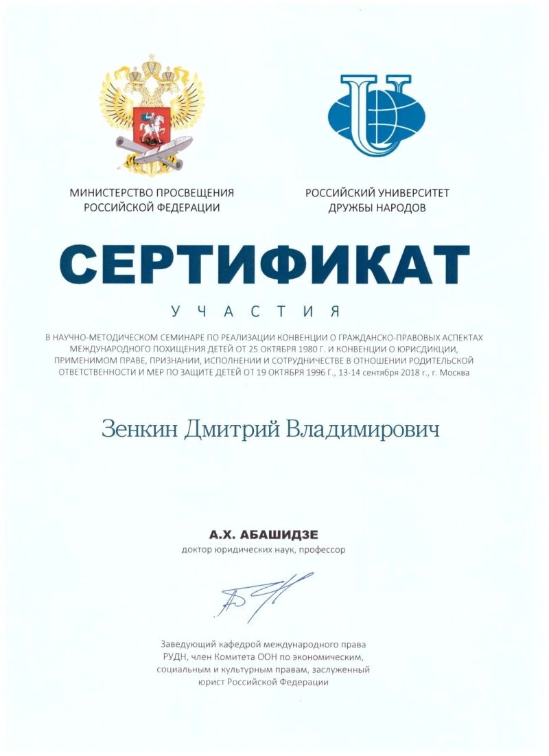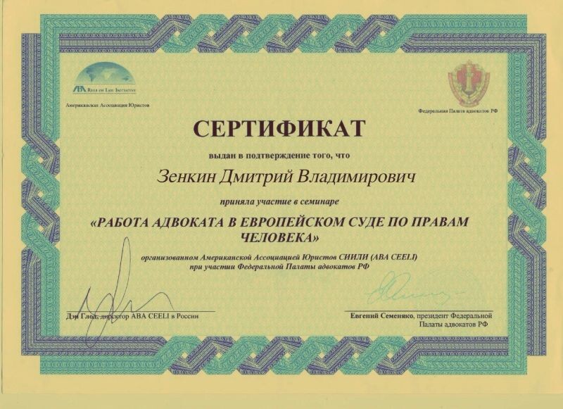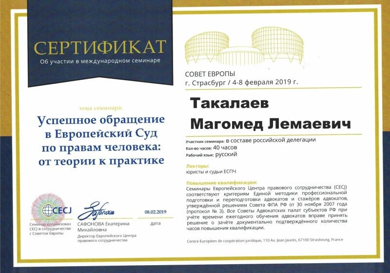 - Сертификат «Успешное обращение в Европейский суд по правам человека: от теории к практике» (с 2019 г.).