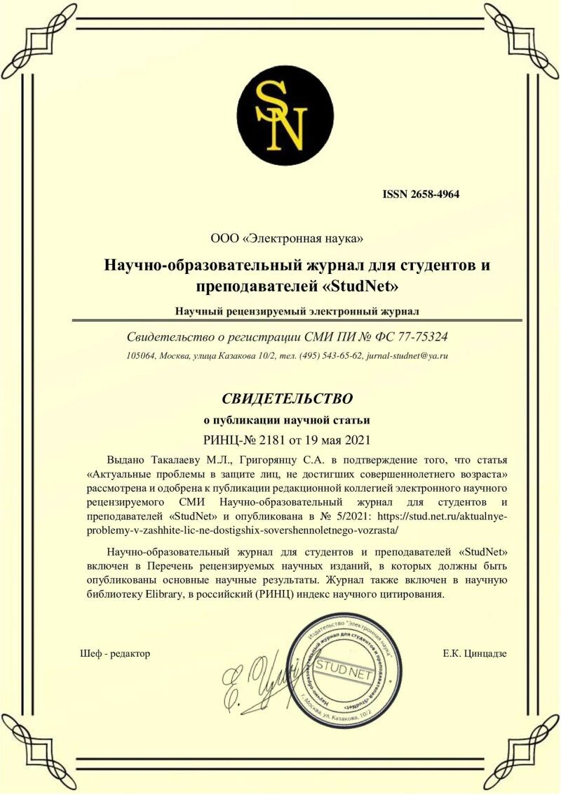 - Свидетельство о публикации научной статьи «Актуальные проблемы в защите лиц, не достигших совершеннолетнего возраста» (с 2021 г.).