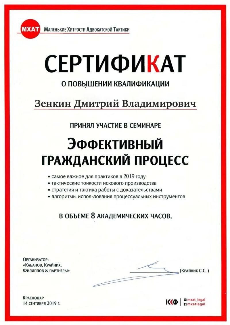 - УЦ «МХАТ», сертификат о повышении квалификации «Эффективный гражданский процесс» (с 2019 г.).