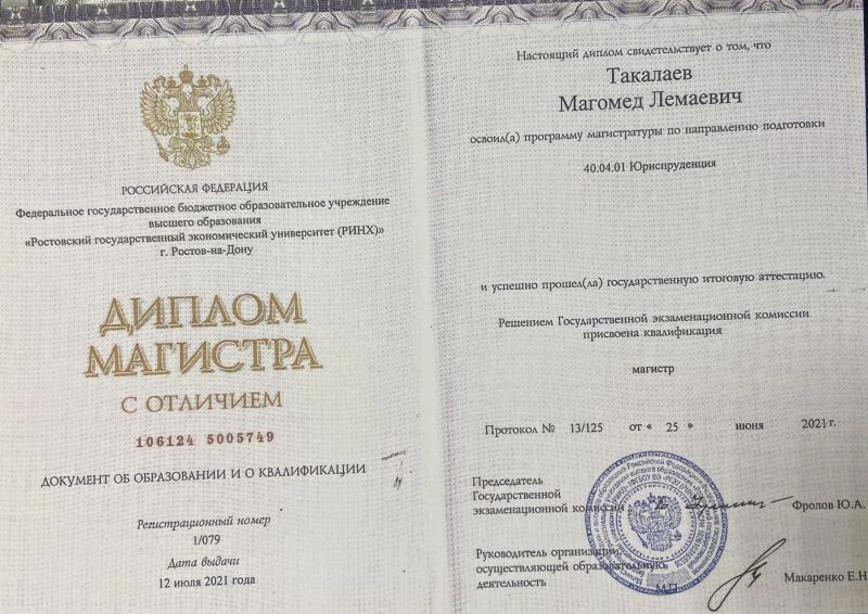 - Федеральное государственное бюджетное образовательное учреждение высшего образования «Ростовский государственный экономический университет (РИНХ)», юридический факультет, юриспруденция, 2019–2021 гг.