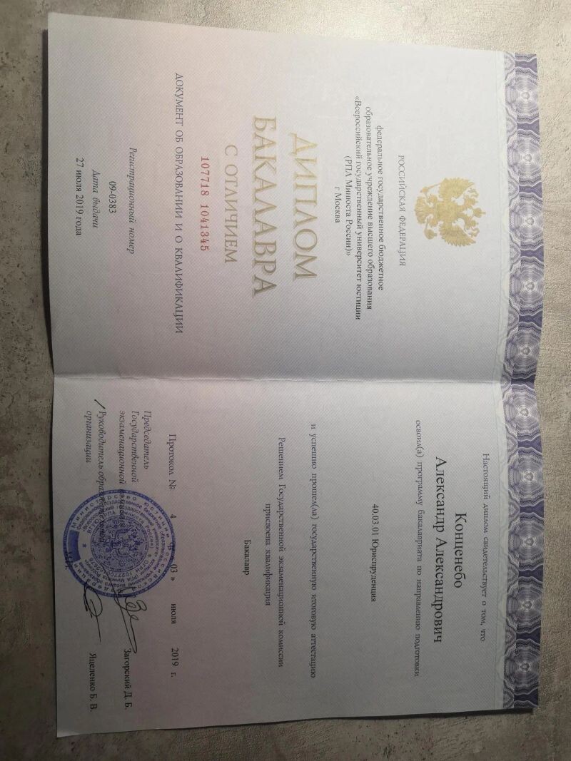 - Всероссийский государственный университет юстиции, юриспруденция, 2019 г.
