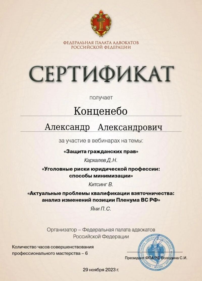 - Федеральная палата адвокатов РФ, участие в вебинарах, 2023 г.