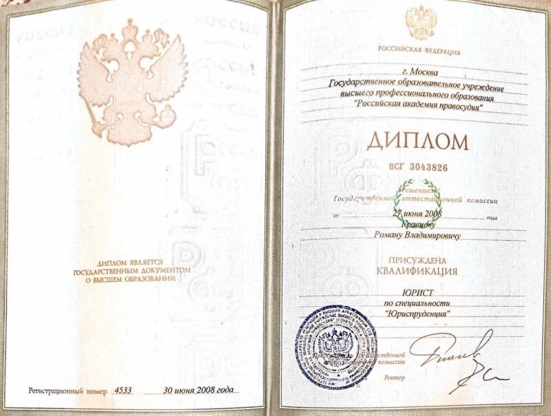 - Государственное образовательное учреждение высшего профессионального образования «Российская академия правосудия», юрист, 2003–2008 гг.