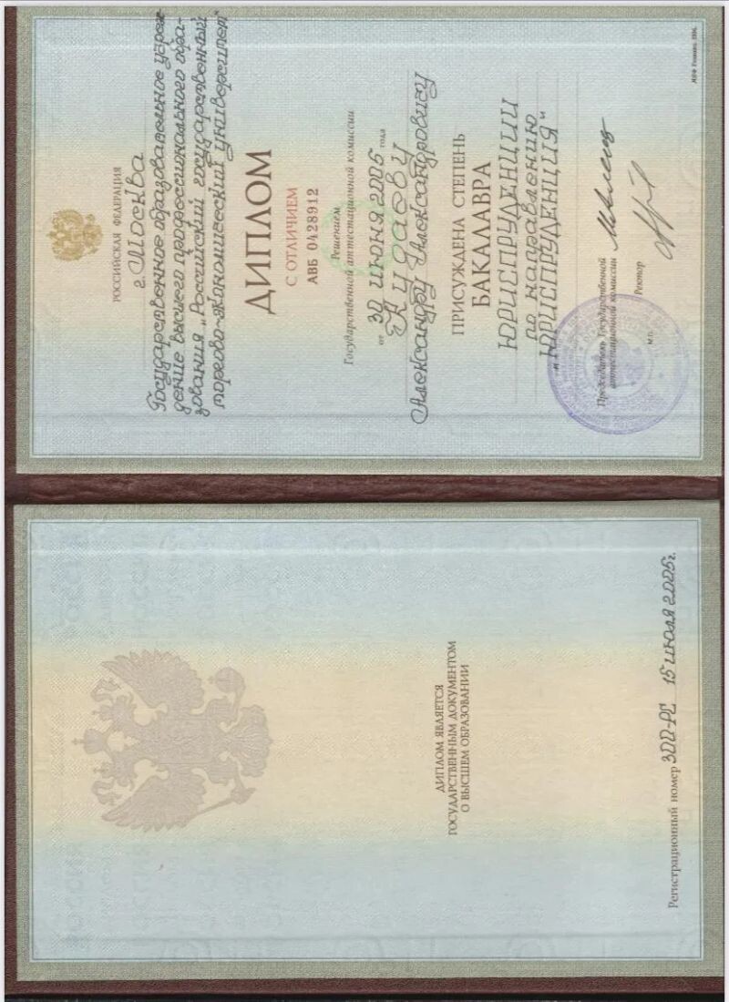 - ГОУ ВПО «Российский государственный торгово-экономический университет», юриспруденция, бакалавр, 2005 г.
