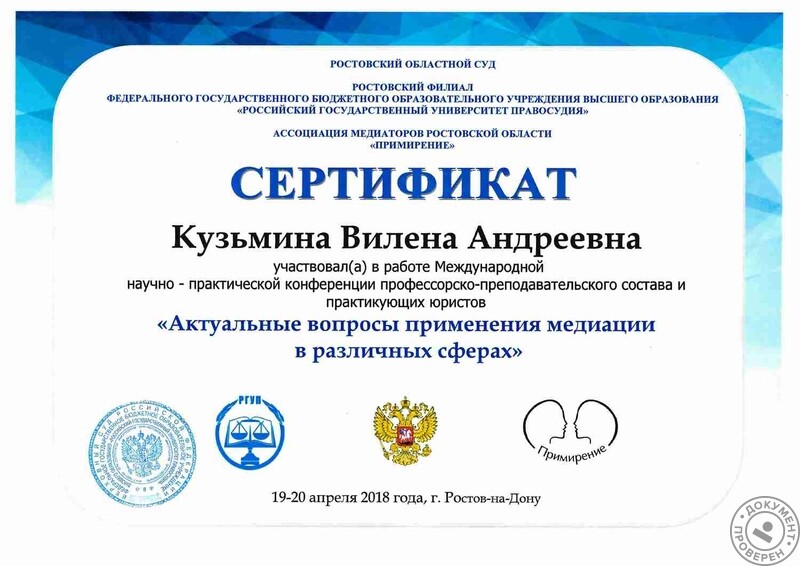 - Участник международной научно-практической конференции профессорско-преподавательского состава и практикующих юристов (2018 г.).
