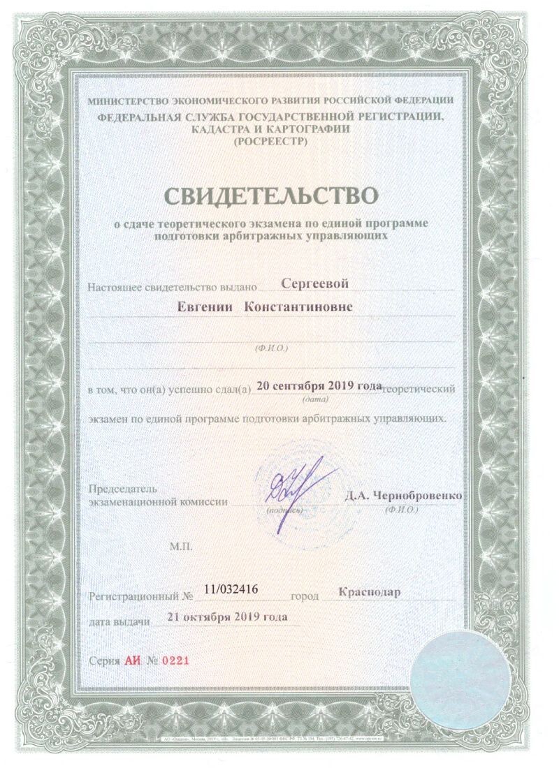 - Федеральная служба государственной регистрации, кадастра и картографии. Свидетельство о сдаче теоретического экзамена по единой программе подготовки арбитражных управляющих, 2019 г.