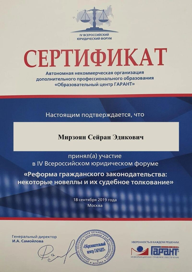 - IV Всероссийский юридический форум «Реформа гражданского законодательства: некоторые новеллы и их судебное толкование», участник, 2019 г.