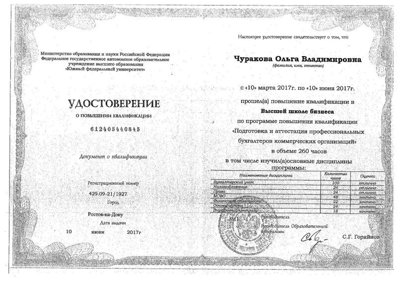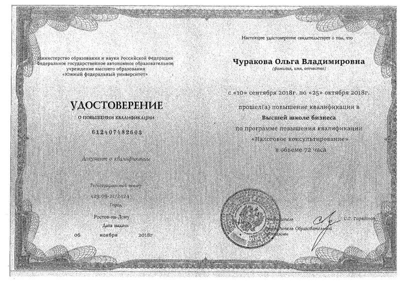 - Южный федеральный университет, повышение квалификации «налоговое консультирование», 2018 г.