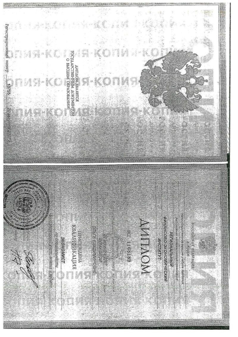 - Региональный финансовый экономический институт (РФЭИ), специальность бухгалтерский учёт, «анализ и аудит», 2002–2007 гг.