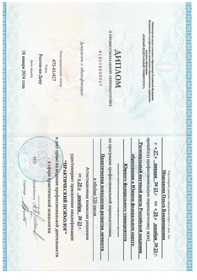 - Южный федеральный университет, квалификация «практический психолог», 2023 г.