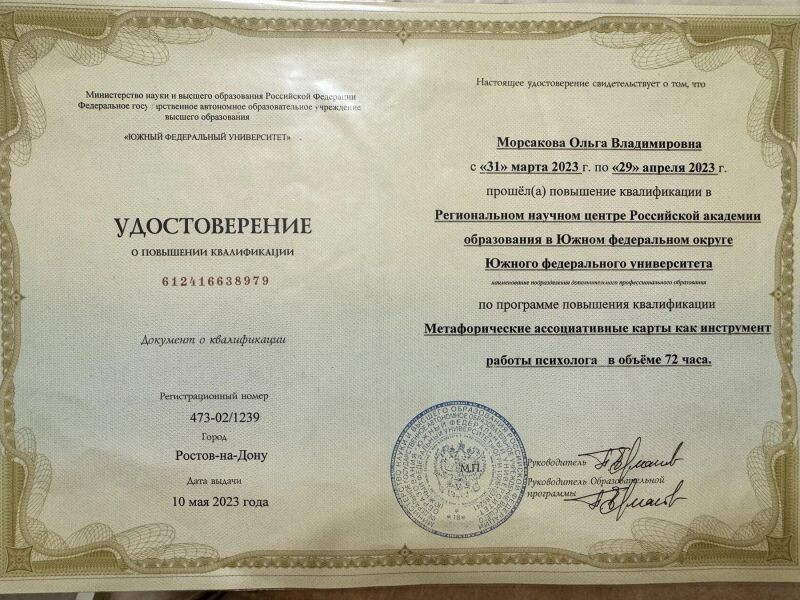 - Региональный научный центр Российской академии образования Южного федерального университета, программа повышения квалификации «Метафорические ассоциативные карты как инструмент работы психолога», 2023 г.