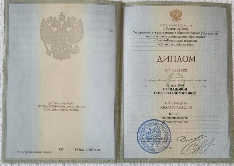 - ФГОУВПО «Северо-Кавказская академия государственной службы», квалификация — юрист, специальность — юриспруденция, 2008 г.