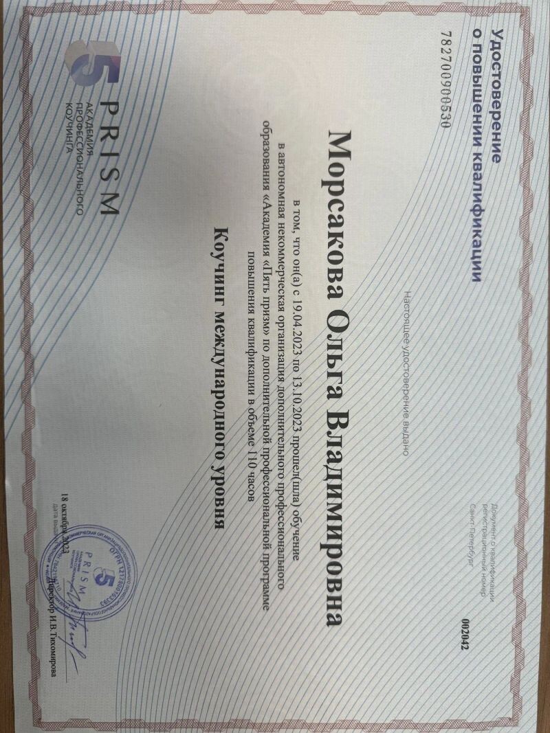 - Академия профессионального коучинга «Пять призм», программа повышения квалификации «Коучинг международного уровня», 2023 г.