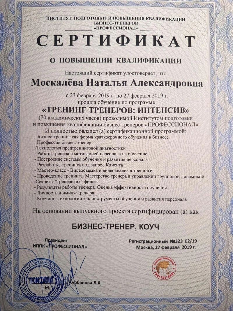 - Институт подготовки и повышения квалификации бизнес-тренеров «Профессионал», программа «Тренинг тренеров: интенсив», 2019 г.