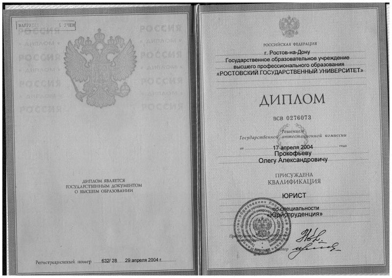 - Ростовский государственный университет, юриспруденция, юрист, 1999–2004 гг.
