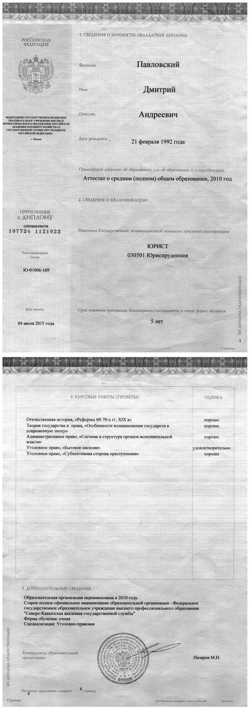 - ФГБОУ ВПО «Российская академия народного хозяйства и государственной службы при Президенте Российской Федерации», юриспруденция, юрист, 2010–2015 гг.