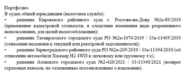 - Межрайонная ИФНС № 18 по Ростовской области, правовой отдел, юрист, 2017–2022 гг.