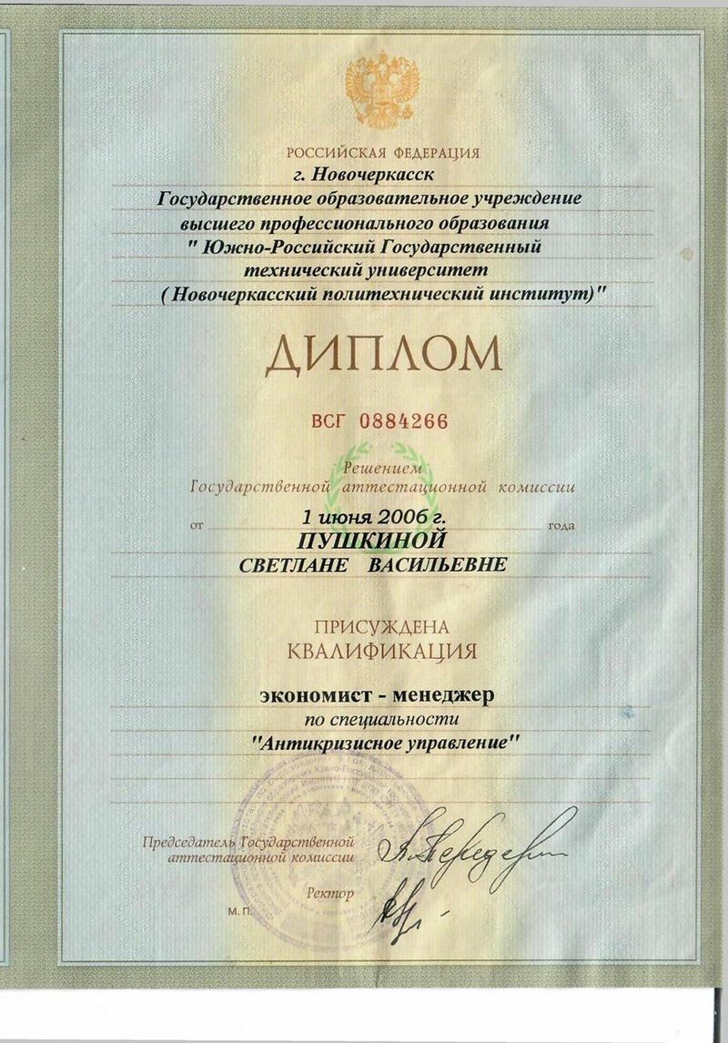 - Южно-Российский государственный технический университет (Новочеркасский политехнический институт), экономист-менеджер, 2000–2006 гг.