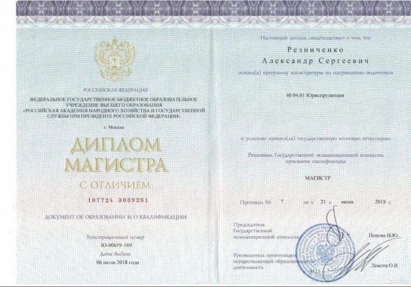 - Российская академия народного хозяйства и государственной службы при Президенте Российской Федерации, юриспруденция, 2015–2018 гг.