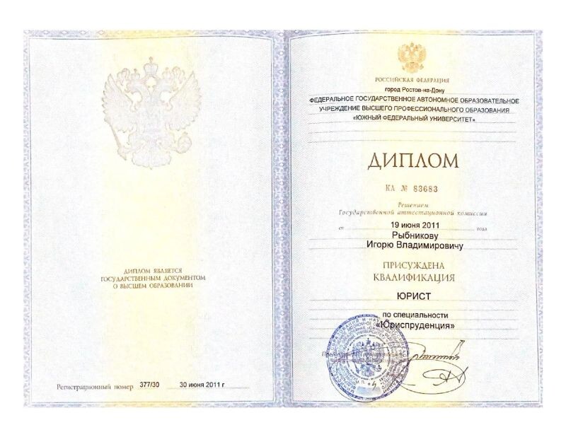 - Южный федеральный университет, юриспруденция, юрист, 2005–2011 гг.