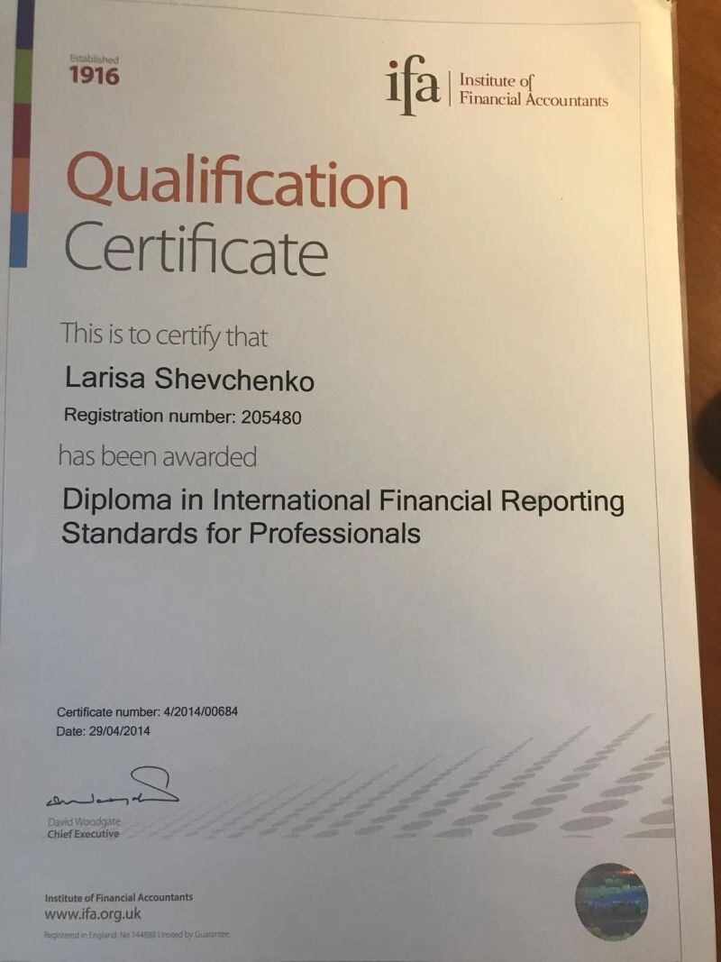 - Сертификат, диплом по международным стандартам финансовой отчётности для профессионалов, 2014 г.