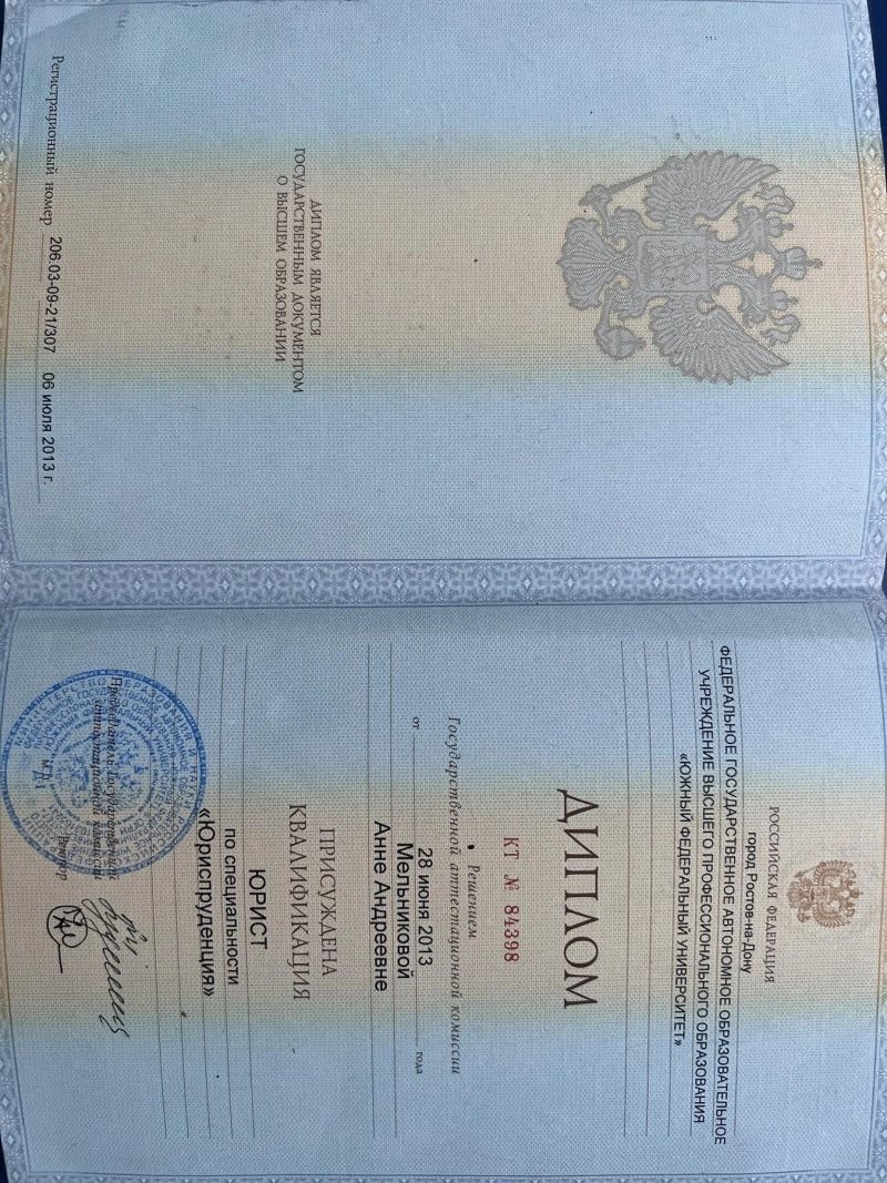 - Южный федеральный университет, юрист, юриспруденция, 2007–2013 гг.