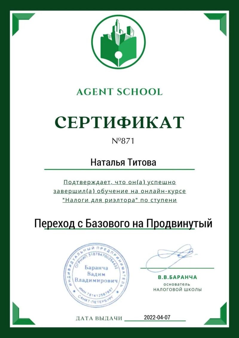 - AGENT SCHOOL, курс «Налоги для риэлтора», 2022 г.