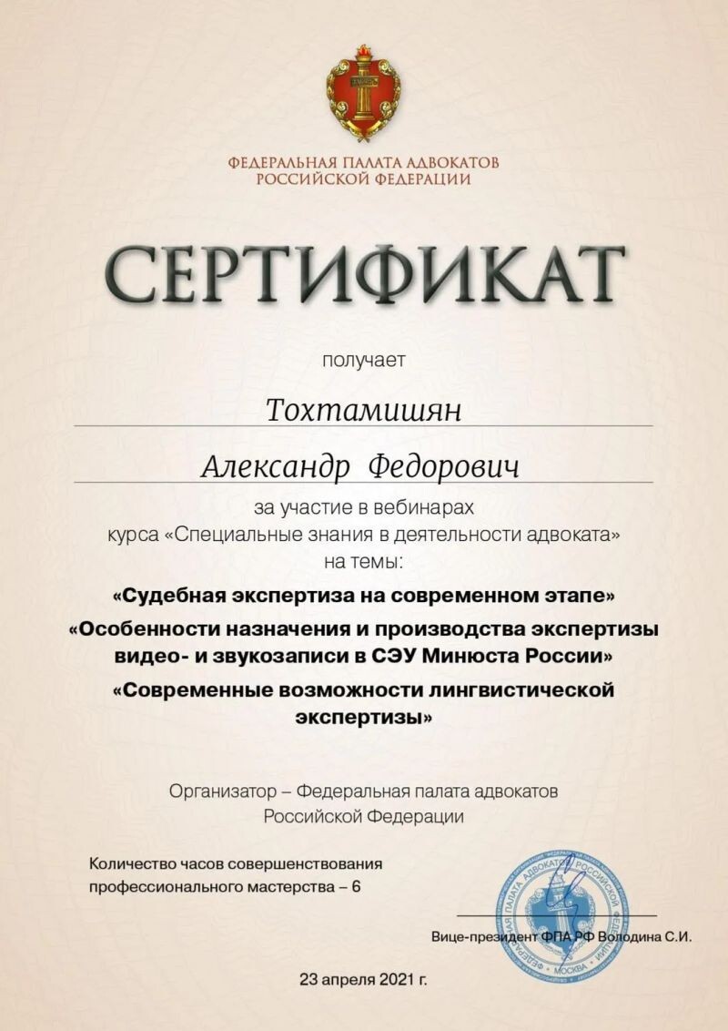 - Федеральная палата адвокатов РФ, курс «Специальные знания в деятельности адвоката», 2021 г.