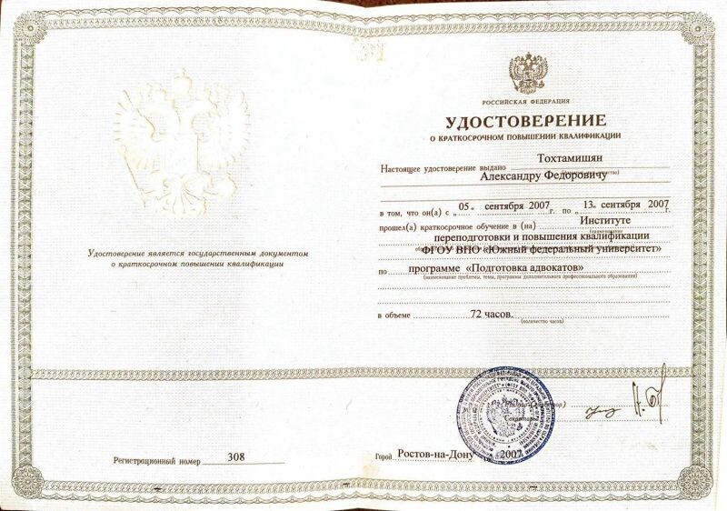 - ФГОУ ВПО «Южный федеральный университет», повышение квалификации адвокатов, 2007 г.