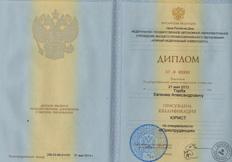 - Южный федеральный университет, квалификация – юрист по специальности «юриспруденция» (2013 г.).
