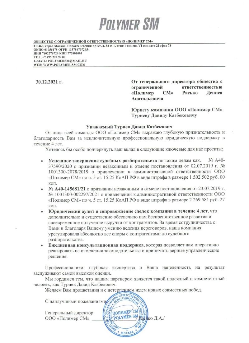 - Благодарность от компании ООО "Полимер СМ" (с 2021 г.).