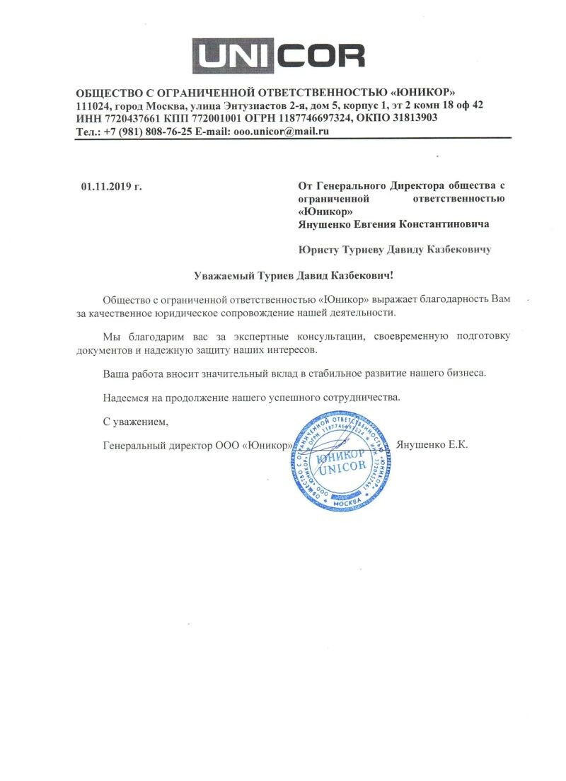 - Благодарность компании ООО "Юникор" (с 2019 г.).