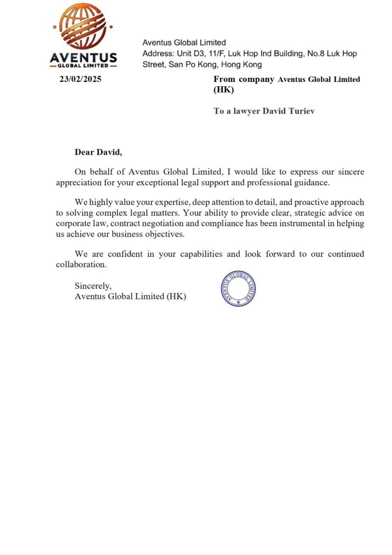 - Благодарность иностранной компании Aventus Global Limited (с 2025 г.).